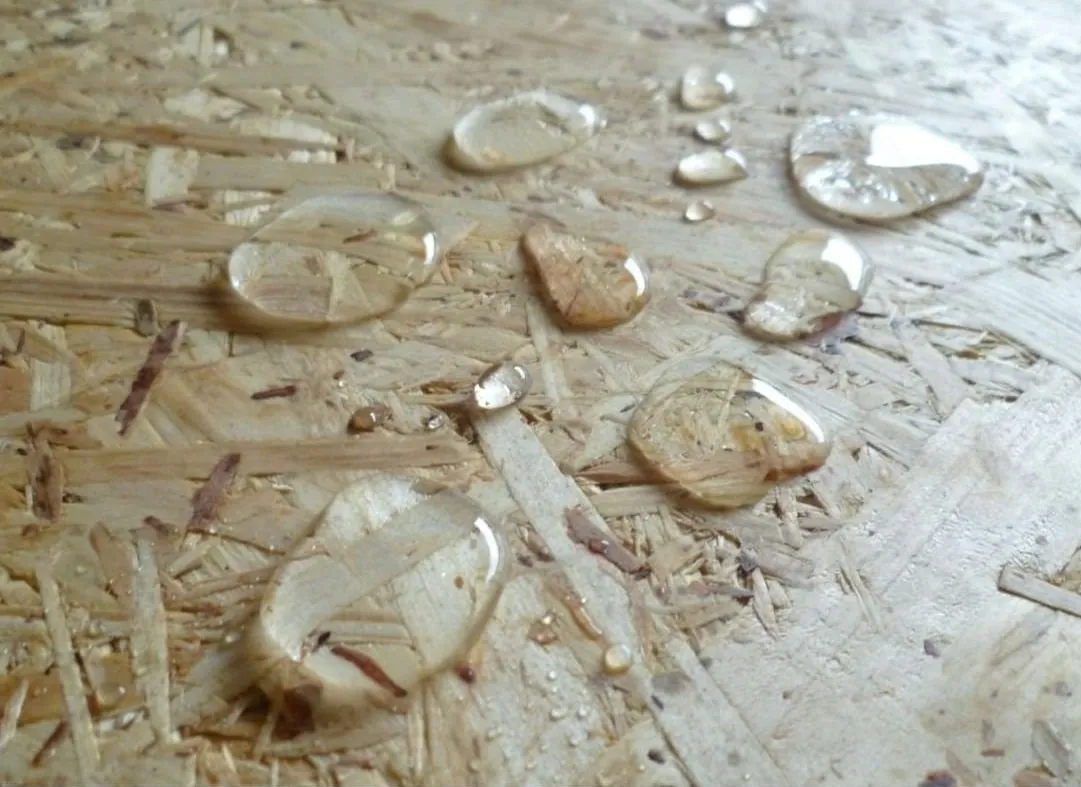 4. Противостояние влаге. Коэффициент набухания листа OSB3 составляет всего 10%. Это говорит о том, что погруженный в воду лист ориентировочно-стружечной плиты на протяжении суток сохраняет все свои свойства и не деформируется! Достигается это благодаря тому, что тонкая щепа, образующая каждый слой плиты, прессуется чрезвычайно плотно. К тому же каждый слой проклеен фенольными смолами, в них отсутствуют пустоты и они не расслаиваются от влаги.