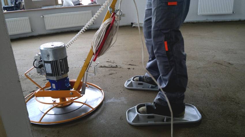 После высыхания цементного раствора поверхность пола обрабатывается шлифовальной машинкой, а при ее отсутствии – абразивным кругом. Для устранения бетонной пыли поверхность пола локально заливается водой.