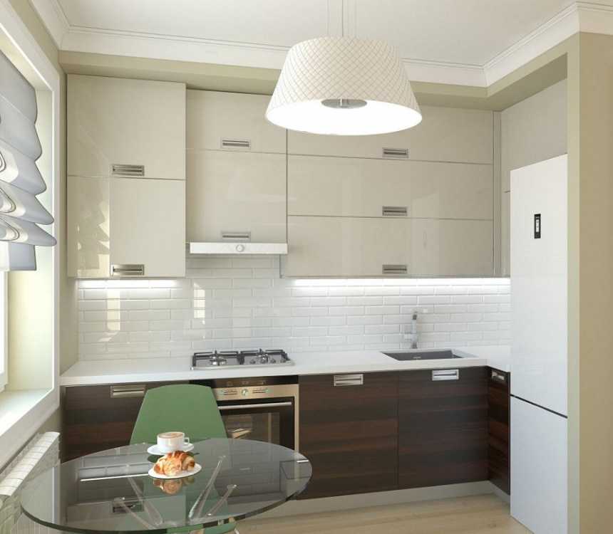 Для малогабаритных кухонь подойдут пастельные тона, персиковый, песочный, молочный, белый, бежевый, коричневый цвет. Желательно, чтобы интерьер был светлым – так помещение будет казаться просторным и свободным. Однако чтобы кухня не напоминала больничную палату и выглядела более стильно и современно, допускается яркий акцент в отдельных деталях.