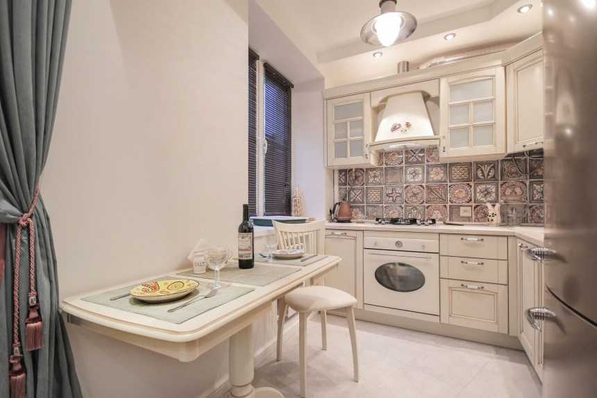 - В интерьере кухни в хрущевке очень уместна складная мебель. Например, обеденный стол со стульями в сложенном виде могут храниться на балконе или в коридоре, и не будут зря занимать место, которого и так мало.