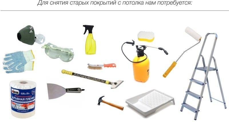 Любой ремонт потолка своими руками начинается с тотального удаления всех старых покрытий. Что нам потребуется на этом этапе?