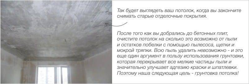 Если на ваш потолок до текущего ремонта была нанесена побелка — читайте о том, как её смыть в другой статье (там же Вы найдете информацию о том, как узнать чем был покрашен потолок ранее).
