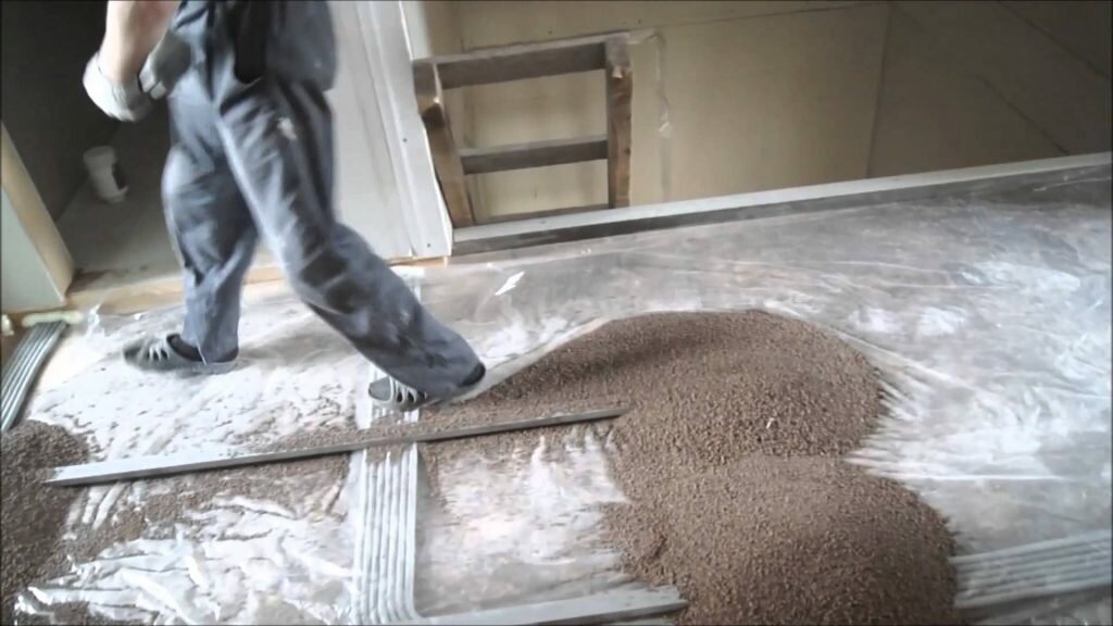 После демонтажа старого пола, поверхность очищается, убирается весь мусор, после чего на поверхность выкладывается полиэтиленовая пленка толщиной более 50 мкм, выполняющая функцию пароизоляции.