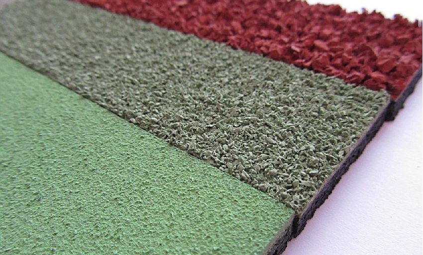Цветная плитка обычно делается двухслойной, где нижняя часть – результат переработки вторсырья, а верх – каучуковая крошка более высокого качества.