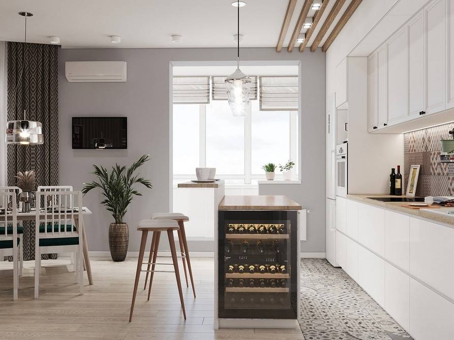 Бескаркасные римские шторы с ламбрекеном в интерьере кухни