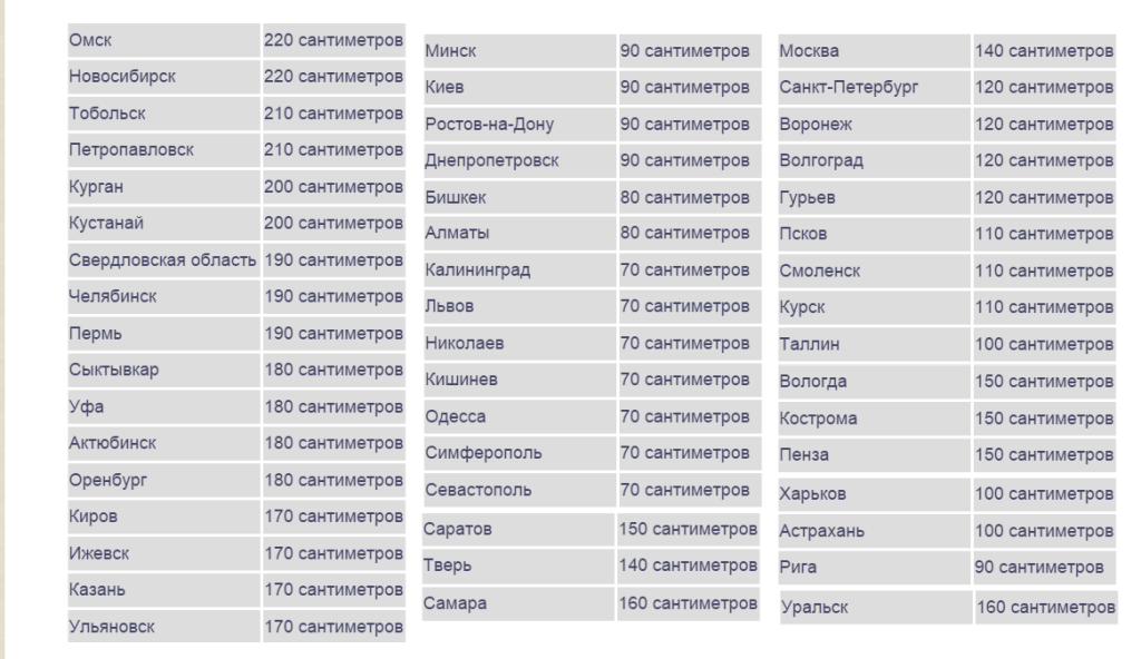 Ниже приведена средняя глубина промерзания грунта в разных регионах. Если вашего региона в таблице нет, то нужно ориентироваться на тот, который находится ближе других.