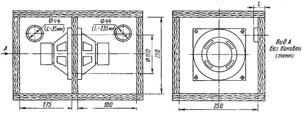 Еще вариант простого, но уже настоящего сабвуфера – со спаренной НЧ ГГ. Спаривание НЧ динамиков – очень эффективный способ повысить класс их звучания. Конструкция сабвуфера на спарке старых 10ГД-30 дана на рис. ниже.