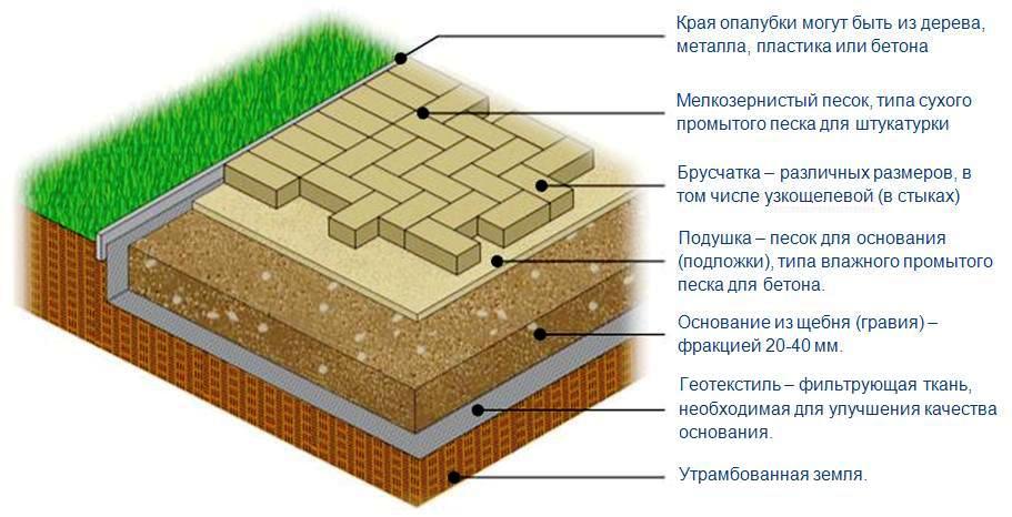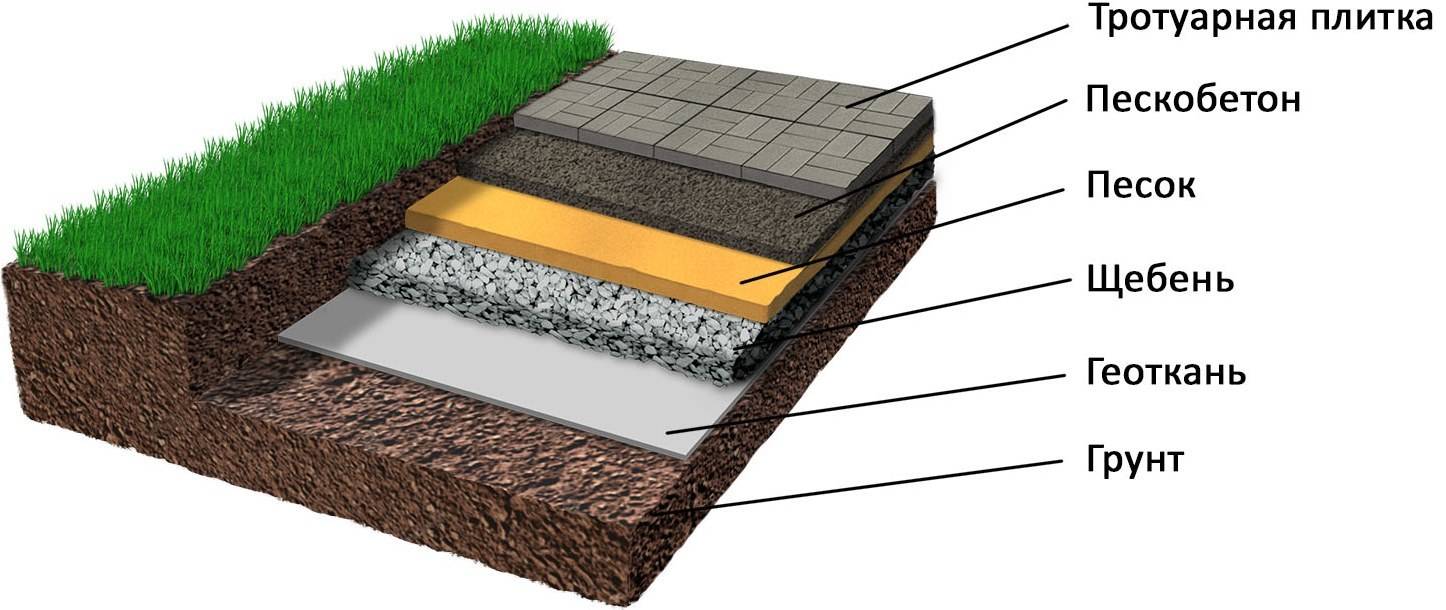 Необходимо, чтобы основание было ровным, без серьезных перепадов высот. Основа, геотекстиль (дорнит), потом щебенка, сверху – слой песка 5 сантиметров. Все хорошо утрамбуйте и лишь после этого залейте плитку. Однако учтите, что многое будет зависеть от типа грунта.
