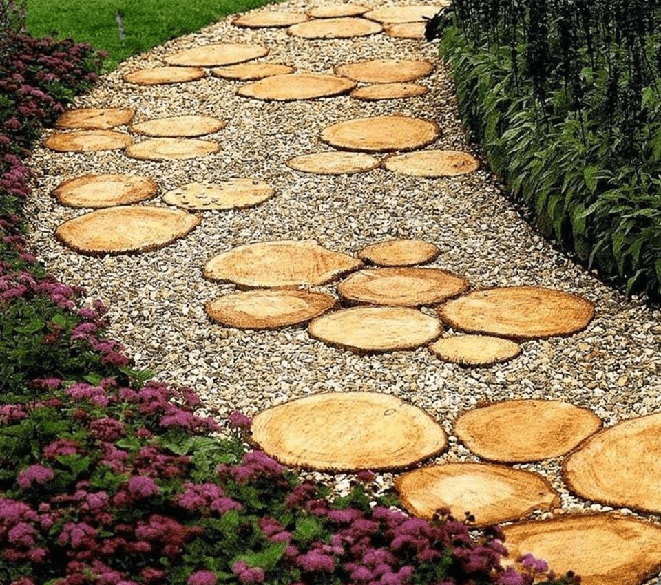 Извилистые дорожки неплохо смотрятся из обычных пеньков. Подготовленные срезы укладывают прямо на землю, оставляя между ними небольшое расстояние.