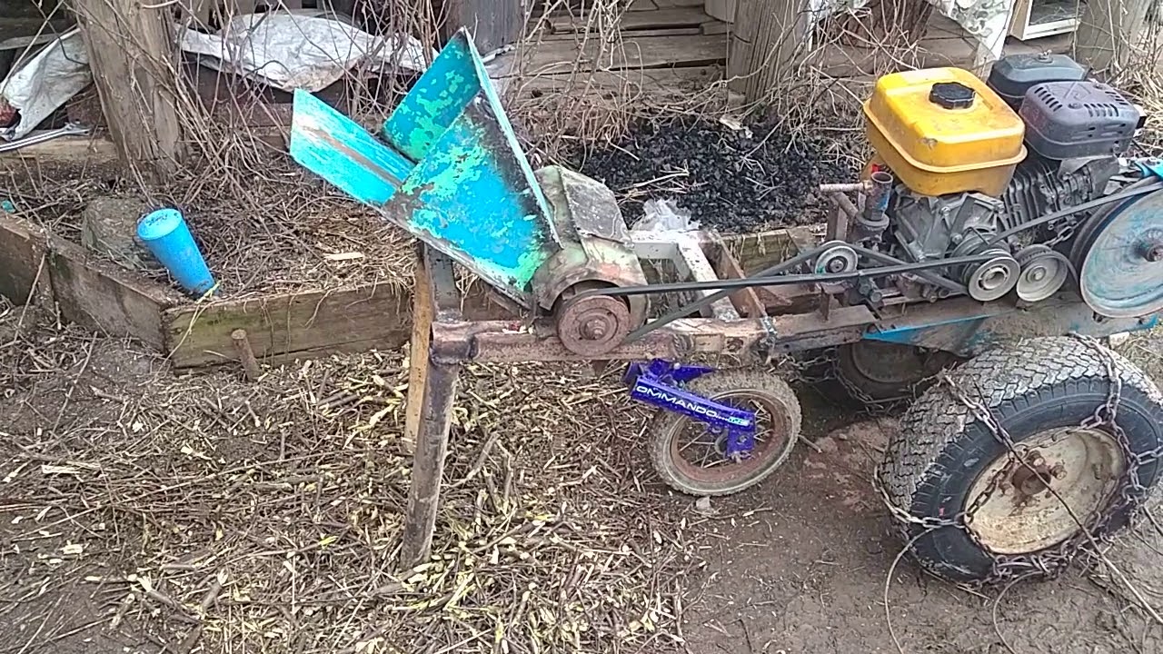 Хорошо, если дома завалялся двигатель от мотоблока. Когда он оснащен валом для отбора мощности, на чиппере появляется возможность менять скорость работы ножей.