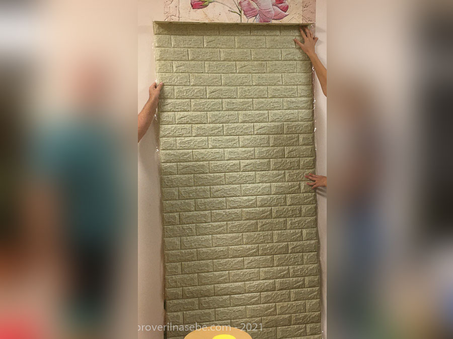 - Самоклеящиеся обои наложить на стену, начиная сверху.
