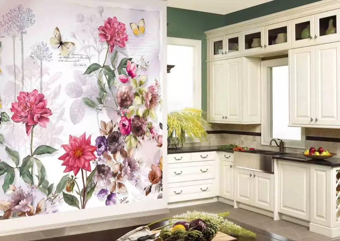 Для кухни самоклеящиеся обои удобны в плане ухода, если выбрана в качестве отделочного материала ПВХ пленка, то ее можно протирать влажной тряпкой, не боясь пятен и других загрязнений. Самоклеящиеся обои могут стать частью декора, оформляя лишь часть стены или фартук.