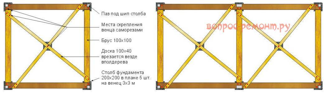 - Весьма желательно угловые столбы (тот же брус 100х100) поставить на т. наз. четвертной шип, подкрепив уголками, см. рис. справа выше, а большие промежуточные каркаса 6х3 – вполдерева, что отмечено на схеме.