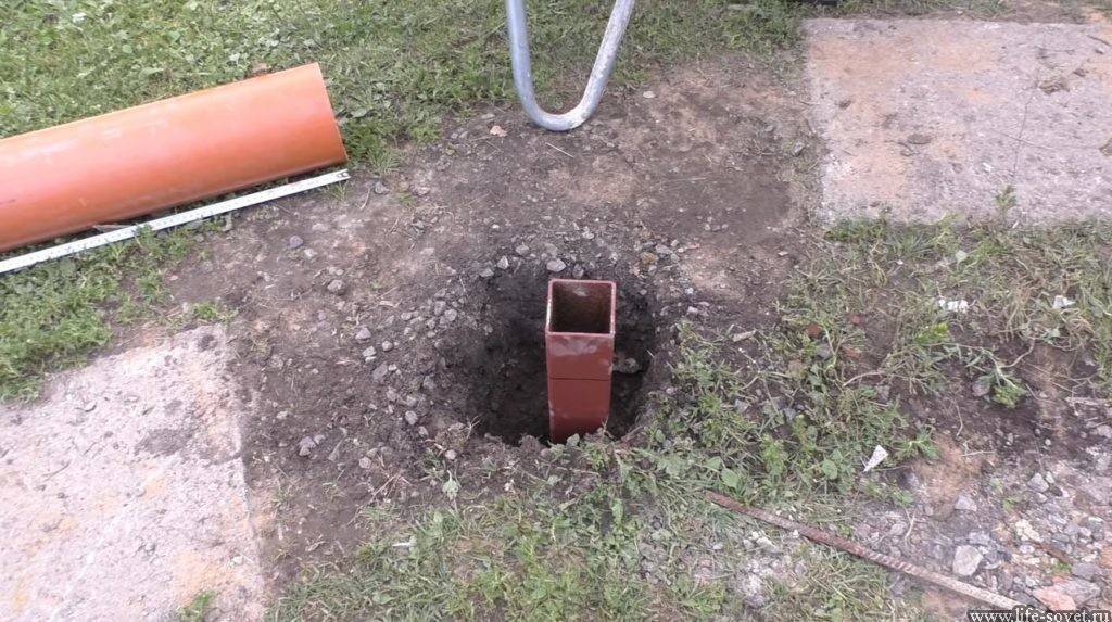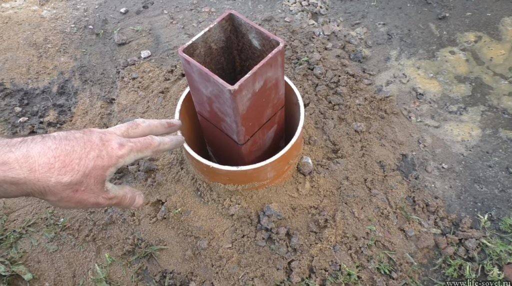 В готовую лунку вставляем сердечник с профильной трубой и начинаем засыпать бетоном, но не полностью, а примерно до половины.