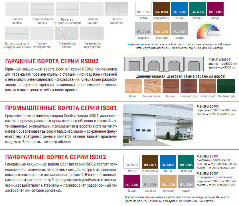 Дорхан выпускает ворота в двух поверхностях и 10 базовых цветах. За доплату в 10% можно заказать имитацию текстуры дерева – золотой дуб и венге.