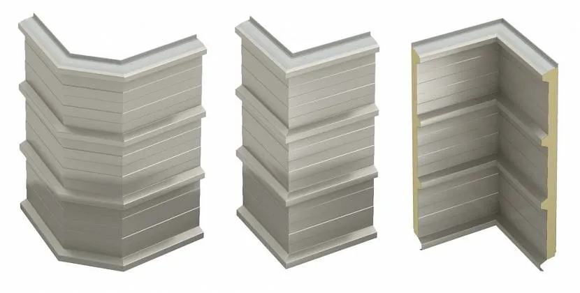 - Угловые сэндвич панели. Используются для создания законченного образа строения. Могут быть полукруглыми или угловые. Производятся из термостойкого пожаробезопасного материала.