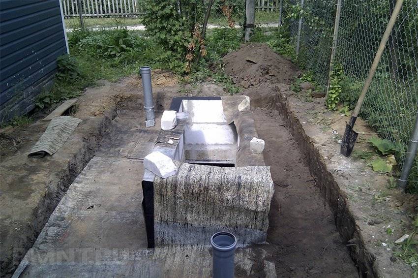 При монтаже на малой глубине разумно перед засыпкой обложить септик плитами пенополистирола. Когда засыпка покроет вводную трубу, плиты ППС режут и укладывают горизонтально, затем продолжают засыпать септик до уровня верхней стенки емкостей.