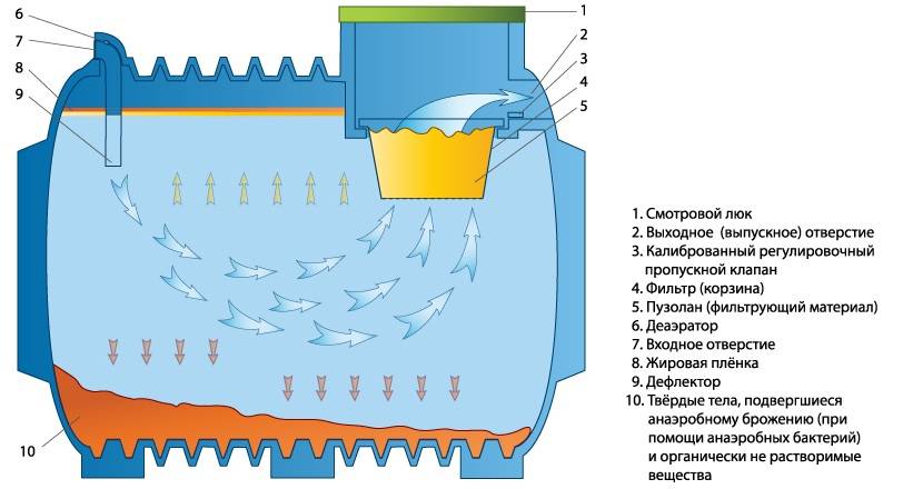 В первой камере отходы разделяются по своему составу: твердые оседают на дне, жидкие переливаются в следующий отсек. Жир всплывает на поверхность и образует пленку, которую необходимо периодически убирать (если не установлены специальные жироуловители). В дальнейшем вода проходит доочистку а аэрированной камере и на поле фильтрации.