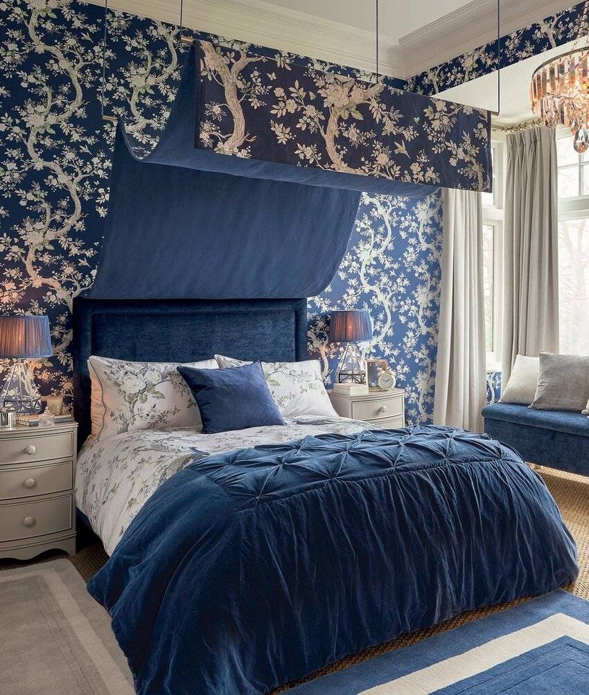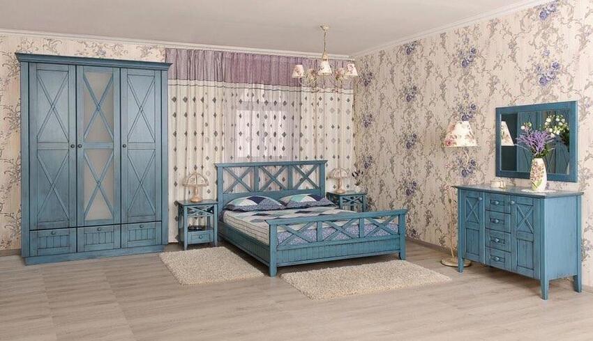 Прованс. Это выбор поклонников французской романтики. Чтобы спальня в синих тонах стала максимально изысканной, используют обои нежных небесных тонов. Легкий и воздушный текстиль обязательно должен быть декорирован цветочными мотивами.