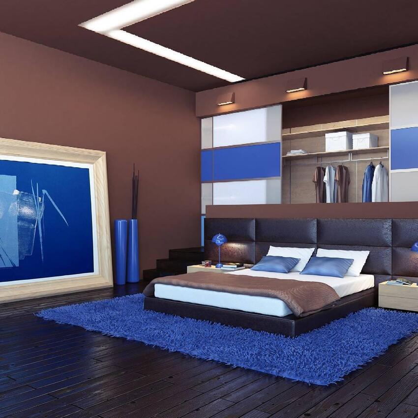 Используя голубой и коричневый цвета в интерьере спальни, следует ввести дополнительный светлый акцент — жёлтый, белый или бежевый цвет. Это спокойное сочетание цветов наиболее подходит для оформления спальни семейной пары.