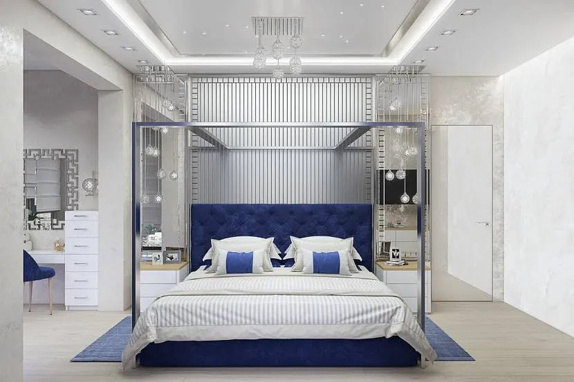 - Модерн. Это роскошь и аристократизм без вычурности. Хорошо будет выглядеть в синей спальне в стиле модерн золотые, серые, фиолетовые акценты.