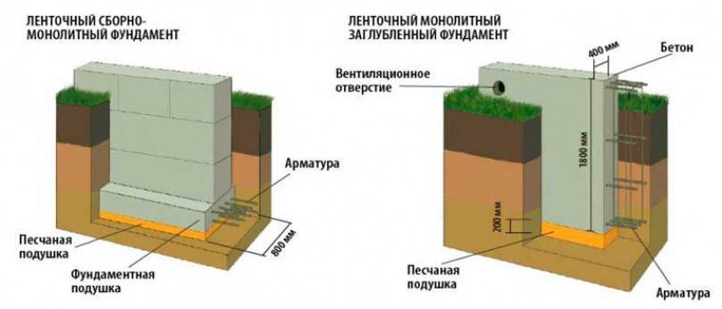 В сложных случаях используют составное сечение ленты, когда опорный элемент — бетонная подушка — имеет большую площадь, позволяя рыхлому грунту прочно удерживать постройку без оседаний, а верхняя часть ленты намного уже, что позволяет уменьшить вес основания и существенно сэкономить стройматериалы.