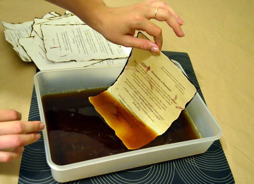 - раствор чайной заварки — понадобится для придания листам бумаги состаренного вида. Желательно приготовить крепкий раствор;
