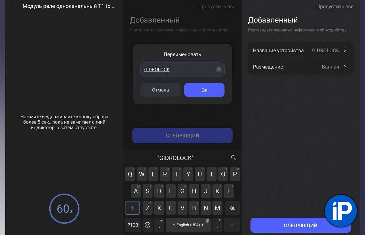4. На главном экране приложения нажимаем «+» в правом верхнем углу.5. В выпадающем списке находим «Модуль реле одноканальный (с нейтралью) Т1» и переходим на окно устройства.6. На реле зажимаем кнопку на 5 секунд до появления световой индикации.7. Задаём имя и другие параметры.