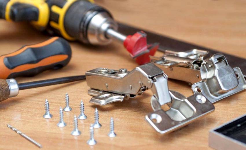 Предпоследний этап сборки мебели – это монтаж дверей на каркас. Для этого используют разные соединительные детали. Одна разновидность – это петли «бабочки». Крепёжный элемент заглубляют в древесину на глубину металлической пластинки. Второй вариант крепления — мебельные петли. Под них сверлом-коронкой делают круглое углубление, в которое устанавливают чашу петли. Такой вид крепления подходит, если в работе участвует ДСП. Завершающим шагом является установка фурнитуры. Для ручек просверливают отверстия и прикручивают их на винты с тыльной стороны изготовленных дверей.