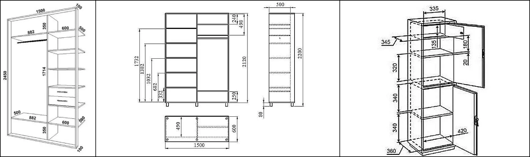 Нередко мастера берут за основу универсальные параметры. Для габаритного мебельного атрибута на лоджии подходит высота 2400-2500 мм, ширина – от 1100 до 1250 мм, глубина – от 450 до 600 мм. Среднее расстояние между полочками – от 340 до 370 мм.