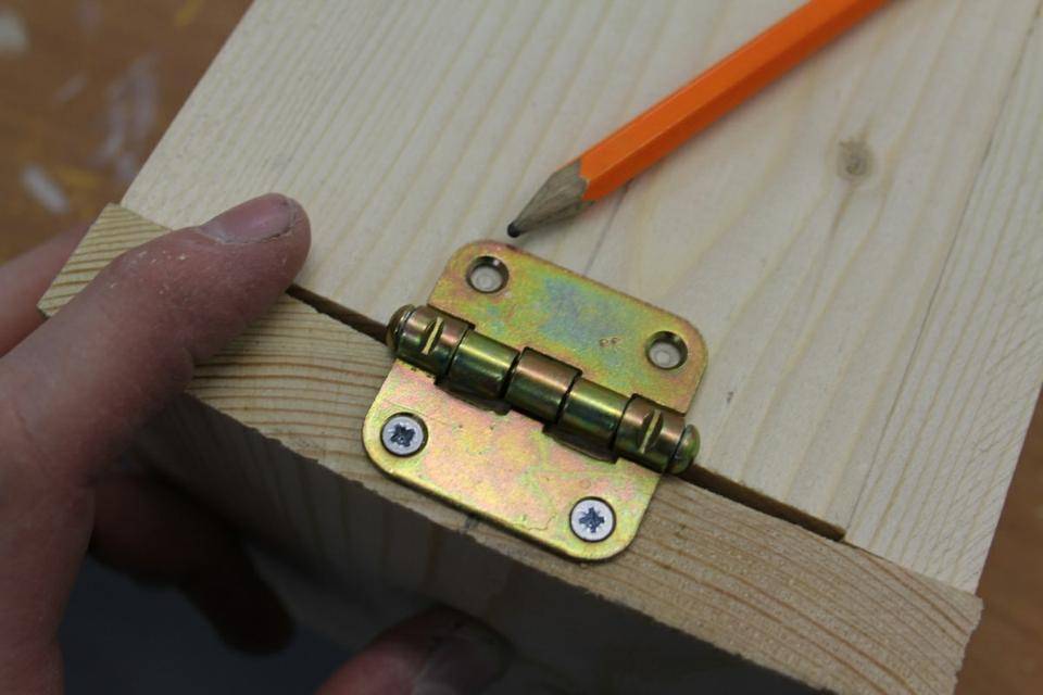 Когда дно готово, выполняем разметку места, куда будет крепится петля для того, чтобы крыша скворечника могла подниматься и опускаться. Это нужно для того, чтобы обеспечить внутрь скворечника доступ: насыпать корм для птиц, а также раз в год убирать скворечник от старых гнёзд.