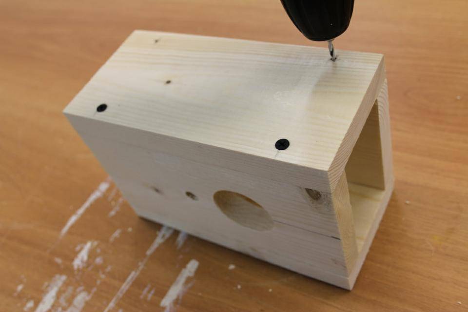 Во время сборки все детали фиксируют саморезами. Чтобы материал не раскололся во время этой процедуры, нужно предварительно просверлить отверстия под крепеж. Сборку лучше начинать с нижней части. К донышку нужно прикрепить боковые стенки. Когда конструкция собрана и надежно зафиксирована, в самую последнюю очередь устанавливается крыша. Ее детали нужно подогнать так, чтобы конек получился симметричным. Доски должны очень плотно прилегать друг к другу, чтобы дождевая вода не протекала в птичье жилище через крышу.