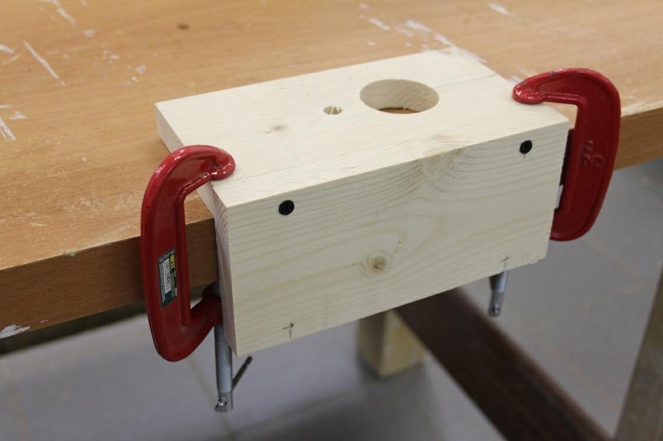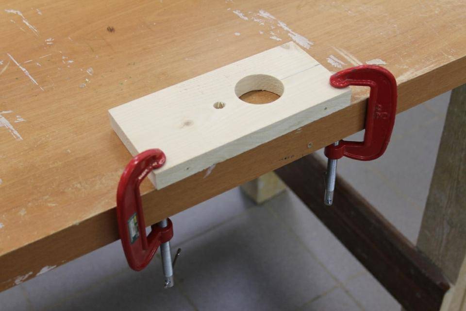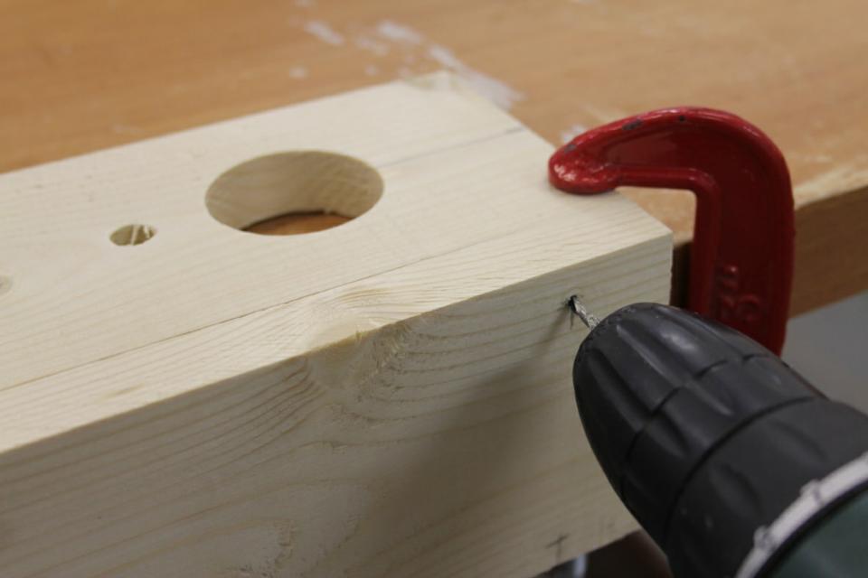 Зажимаем с помощью струбцины крепление и сверлим в нём отверстия для гвоздей.