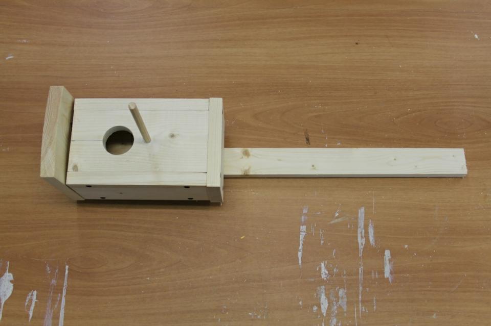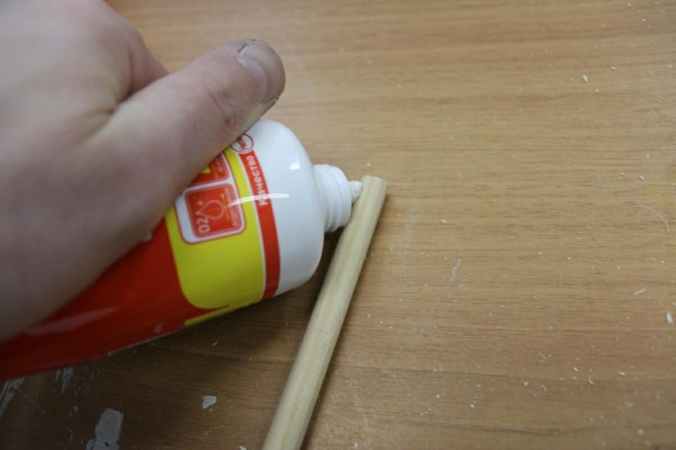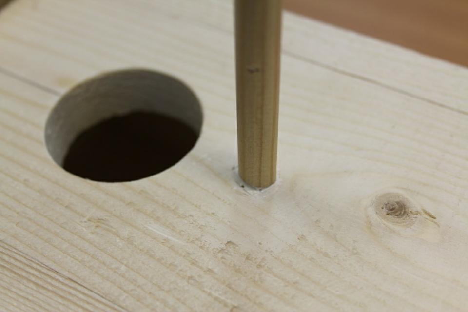 Осталась последняя деталь — жёрдочка. С помощью столярного клея вклеиваем жёрдочку в меньшее отверстие. Столярный клей высыхает в течение 15 мин.