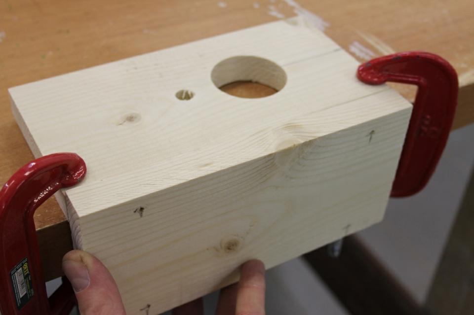 Для того чтобы сделать отверстие в лицевой части скворечника используем круглую фрезу диаметром 45 мм. Фрезу вставляем в дрель вместо сверла. На несколько сантиметров ниже от большого отверстия — делаем отверстие поменьше — для будущей жёрдочки для птиц. Для этого используем сверло диаметром 8 мм.