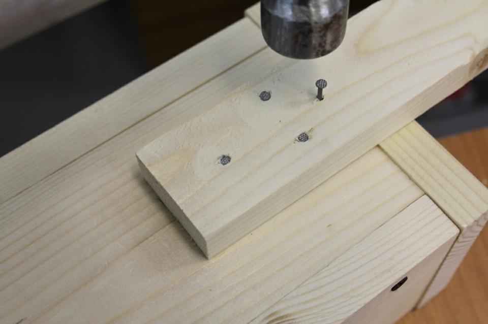 - переднюю стенку с летком прибивают к боковинам, по 3–4 гвоздя на каждую сторону;