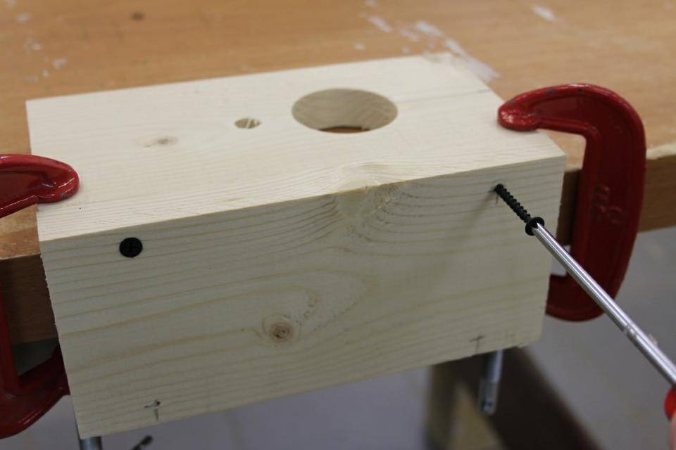 Освобождаем нашу заготовку от струбцин. С помощью толстого сверла делаем насечки на внутренней части лицевой панели. Они нужны для того, чтобы птенцам было более удобно выбираться из скворечника наружу.