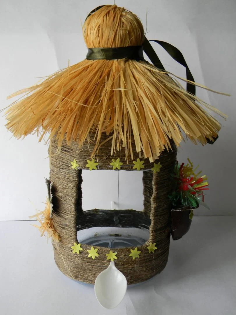 В бутылке из пластика края летка получаются острыми. Чтобы обезопасить лапки птиц, отверстие лучше с внутренней стороны обложить пластилином.