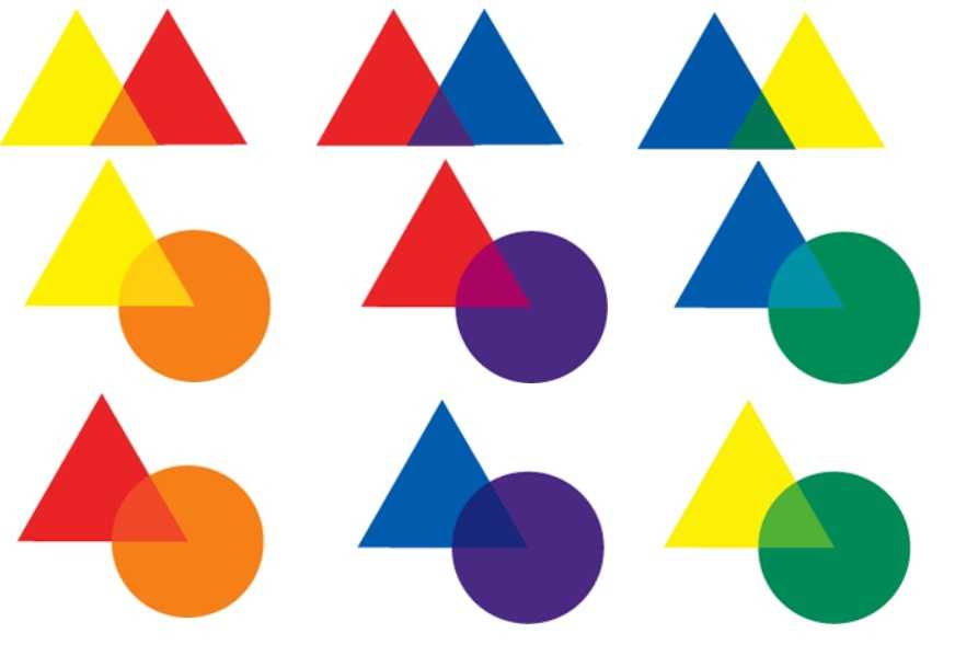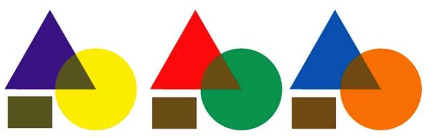 Первый метод полностью отвечает данным в таблице. Если речь идет о наложении цвета, то здесь результат непредсказуемый. Одним из самых простых вариантов оптических иллюзий является лессировка: на поверхность наносят темный тон, после его высыхания кладут краску немного светлее, а затем совсем светлую. В результате каждый цвет будет просматриваться сквозь верхние слои.
