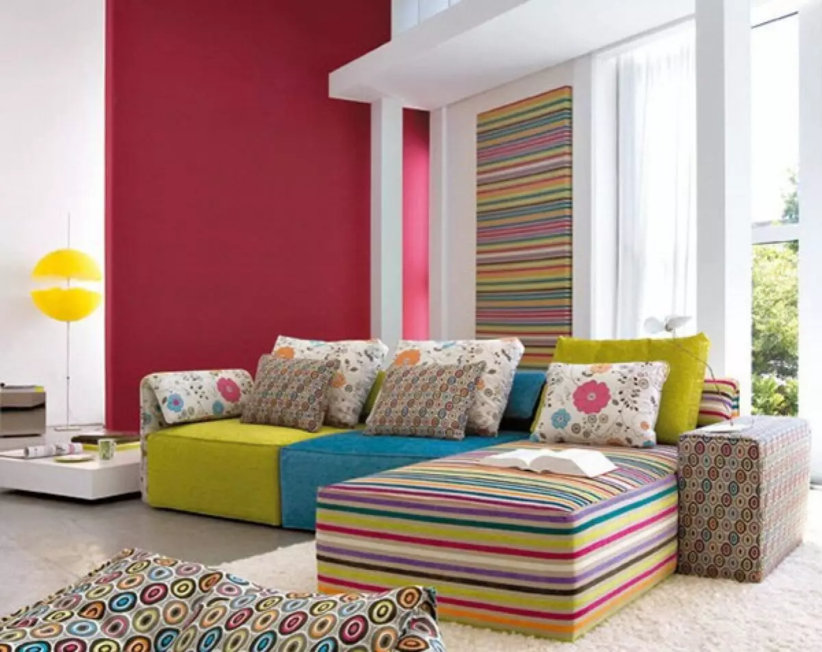 Контрастный тип. Считается наиболее рискованным и требует мастерства в подборе цветов. При сочетании противоположных оттенков (зеленый и красный, желтоватый и синий) надо учитывать, что яркие краски добавляют друг другу насыщенности. Чтобы подстраховаться и не ошибиться с многоцветием, дизайнеры рекомендуют один оттенок сделать основным/фоновым и оформить в нем примерно 70-75% интерьера. Для дополнительных деталей хватит 20-25%. На яркие, нарядные акценты придутся оставшиеся 5%.