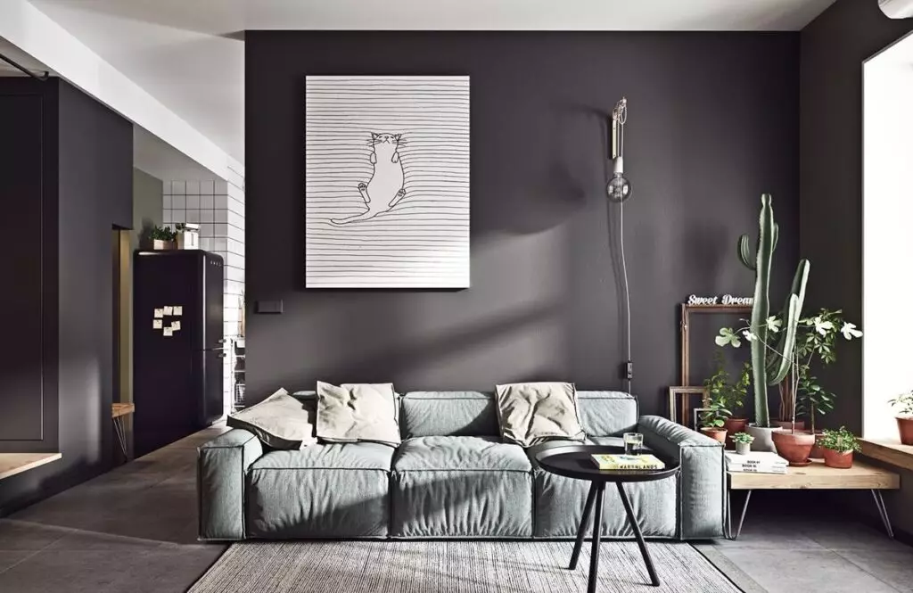 Спокойные оттенки на стенах можно разбавить мебелью с таким же нейтральным цветом, только на тон выше или ниже. К примеру, бежевые стены – серый диван.