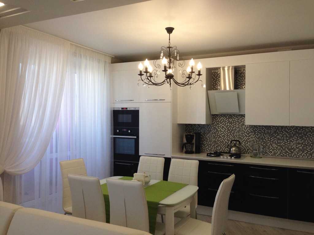 Не выходит из моды сочетание белого и черного цвета, кроме того, если грамотно использовать эти цвета, можно визуально изменить помещение, выставив его в более выгодном свете. Благодаря белым шторам, кухня будет казаться просторнее и светлее, а легкий черный узор приятно разнообразит ткань.