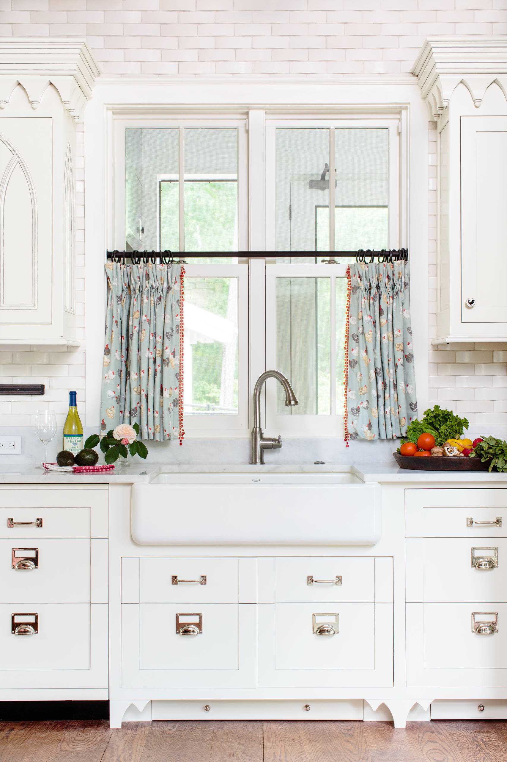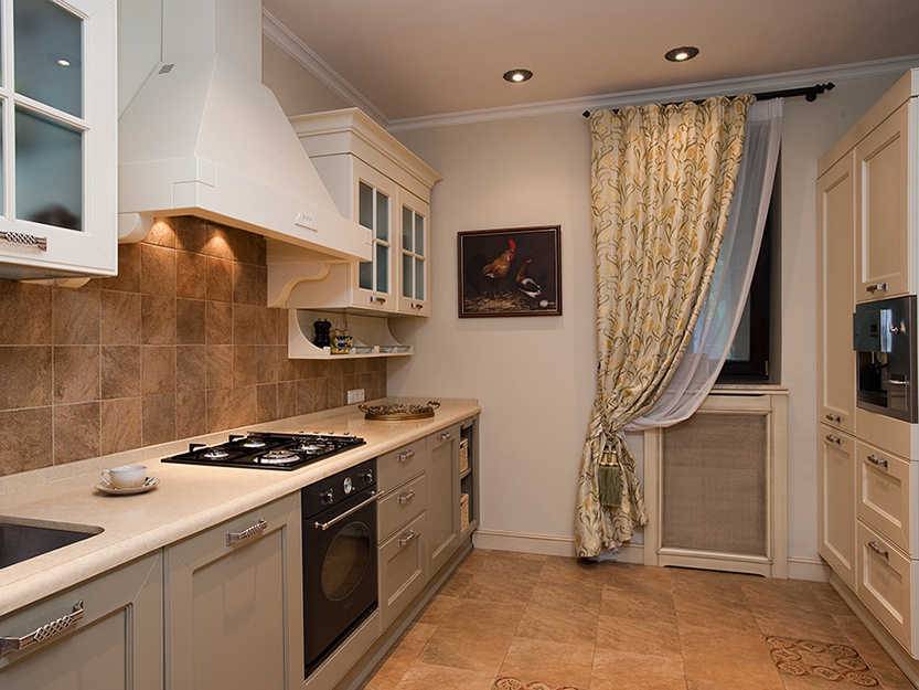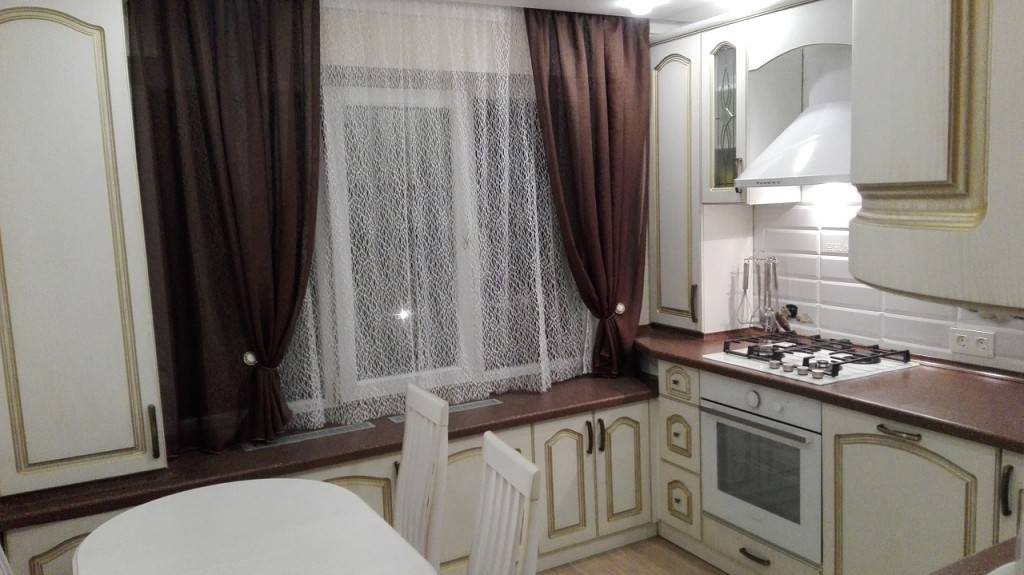 Для оконных занавесок стоит выбрать натуральные ткани (ситец, батист, шелк). Данные материалы помогут создать уют и комфортную атмосферу. Украшением кухни станут короткие и практичные занавески. Длина их не должна быть ниже подоконника