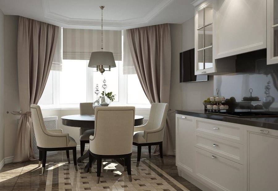 Шторы с эркером. Лучше всего подходят для больших по площади кухонь. Они создадут некоторое театральное оформление. Главное, что следует учесть, это не допустить эффекта тяжести ткани.