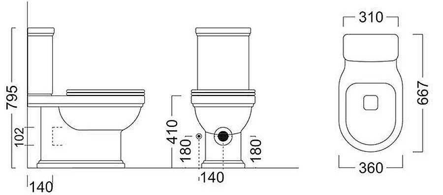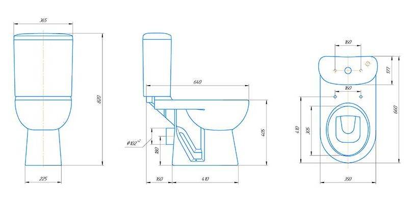 Унитаз типа Компакт (с бачком, который крепится сзади) имеет следующие габариты: