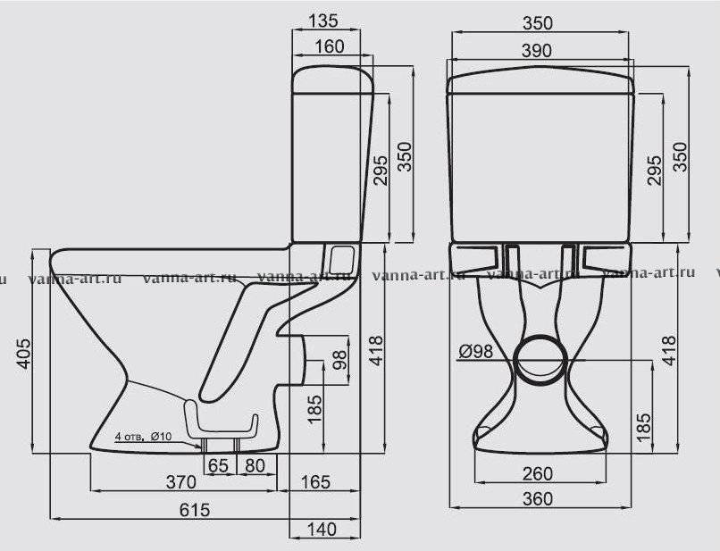 - ширина (обычно бачок шире, но не всегда) — 360-420 мм;