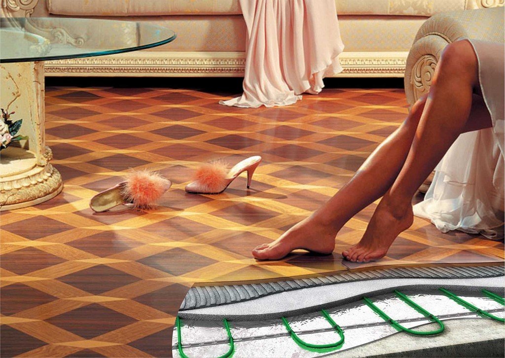 - Далее укладывается чистовое напольное покрытие. Любое, подходящее для использования в системе полов с подогревом.