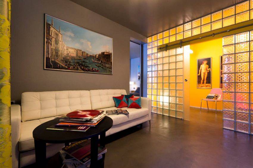 Традиционно в гостиной совмещается больше всего функций, поэтому именно ее чаще всего зонируют в современных квартирах и домах. Стеклянные перегородки подойдут даже для небольших комнат, чтобы символически отделить зону отдыха, рабочее место либо творческую мастерскую.