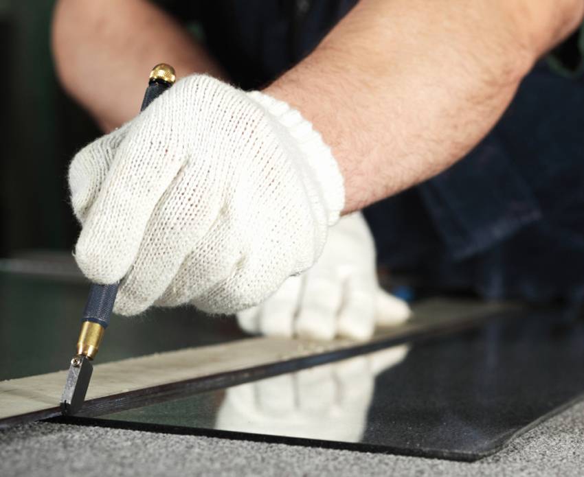 Стекло для стола необходимо положить на ровную поверхность. Потом требуется выполнить разметку карандашом и лишь после этого обрезать материал. Для порезки нужно смочить инструмент растительным маслом, приложить линейку к разметке и пройтись стеклорезом по линии. В результате на стеклянном листе останется незначительная выемка.