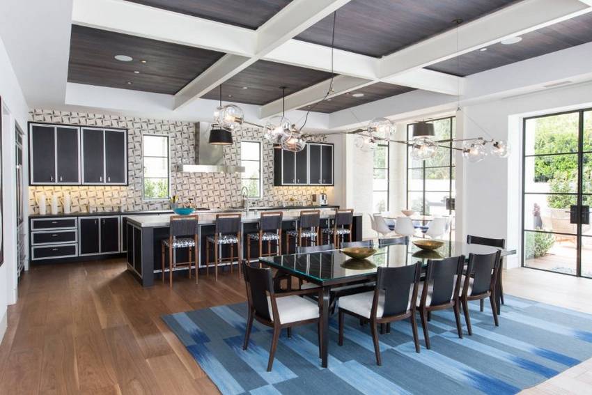 Стеклянные прямоугольные столы могут зонировать помещения, отделяя кухню от гостиной. Благодаря визуальной легкости стекла, такое зонирование выглядит оригинально и ненавязчиво. Если стол не накрывают ежедневно на большую компанию, то один из его концов можно украсить цветами или декором.